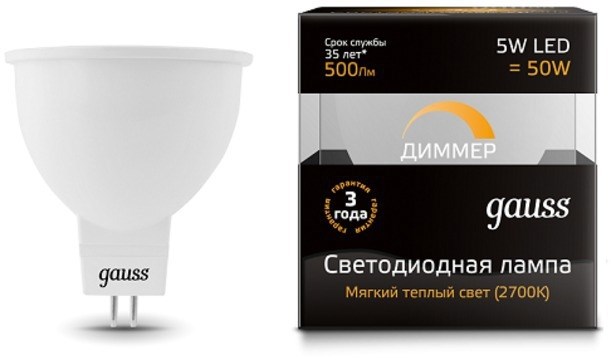 Gauss Лампа MR16 5W 500lm 3000K GU5.3 диммируемая LED 101505105-D