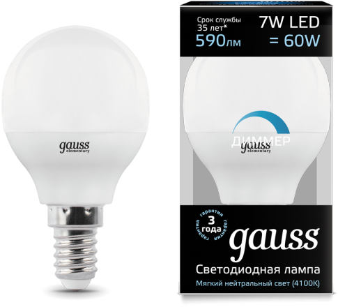 Gauss Лампа Шар 7W 590lm 4100К Е14 диммируемая LED 105101207-D