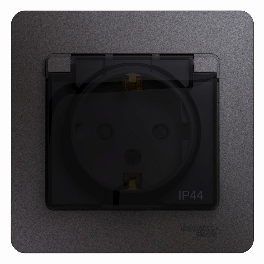 Розетка Systeme Electric (ранее Schneider Electric) серии Glossa (в сборе, цвет графит) одинарная с заземлением, шторками и крышкой подходит для сетей 250 В, на ток 16 А. - Изделие со степенью защиты IP44 обеспечит безопасность использования в ванной и на кухне. - Заземляющий контакт обеспечивает дополнительную защиту от удара электрическим током. При наличии заземления электрический потенциал уходит в землю, защищая человека. - Выполнен из материала PС+ASA, стойкого к УФ-излучению и появлению царапин.