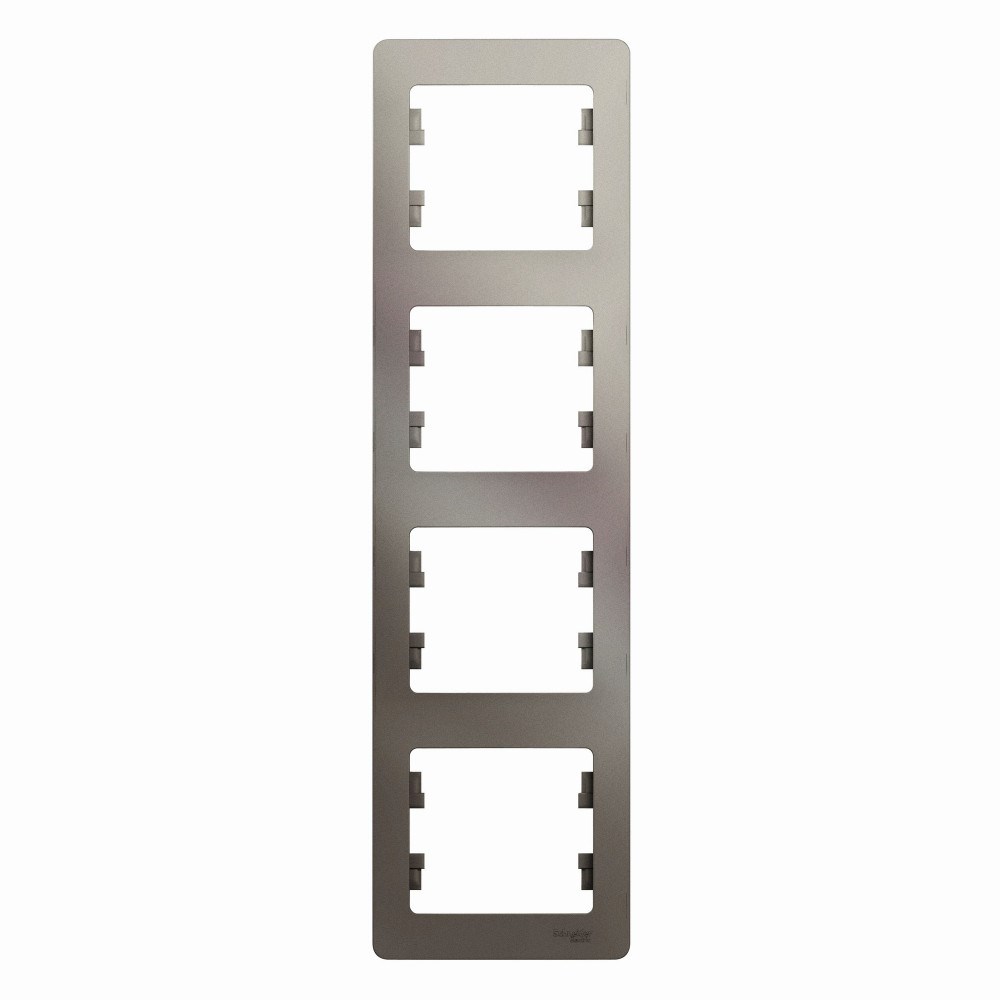 Рамка Systeme Electric (ранее Schneider Electric) серии Glossa (цвет платина) четырёхместная. - Устанавливается в вертикальном положении. - Выполнена из материала PС+ASA, стойкого к УФ-излучению и появлению царапин. - Позволяет гармонично вписать электроустановочное изделие в интерьер помещения.