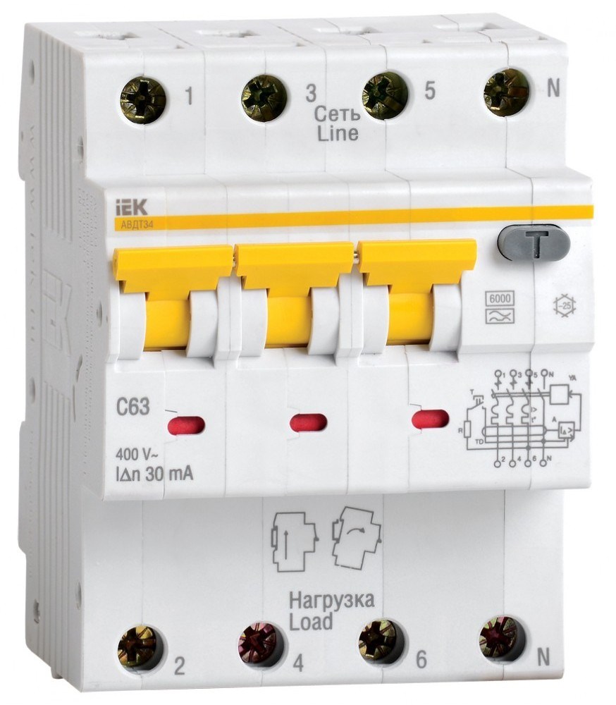 Автоматические выключатели дифференциального тока АВДТ34 предназначены для защиты человека от поражения электрическим током при повреждении изоляции электроустановок, для предотвращения пожаров вследствие протекания токов утечки на землю и для защиты от перегрузки и короткого замыкания в сетях переменного тока напряжением 400 В и частотой 50 Гц. АВДТ34 со встроенной защитой от сверхтоков реагируют не только на синусоидальные переменные дифференциальные токи, но и на пульсирующие постоянные дифференциальные токи. Источником пульсирующего тока являются, например, стиральные машины с регуляторами скорости, регулируемые источники света, телевизоры, видеомагнитофоны, персональные компьютеры и др. АВДТ34 выпускаются в четырехполюсном исполнении на номинальные токи 6, 10, 16, 20, 25, 32, 40, 50, 63 А и номинальные отключающие дифференциальные токи 10, 30, 100, 300 мА.
