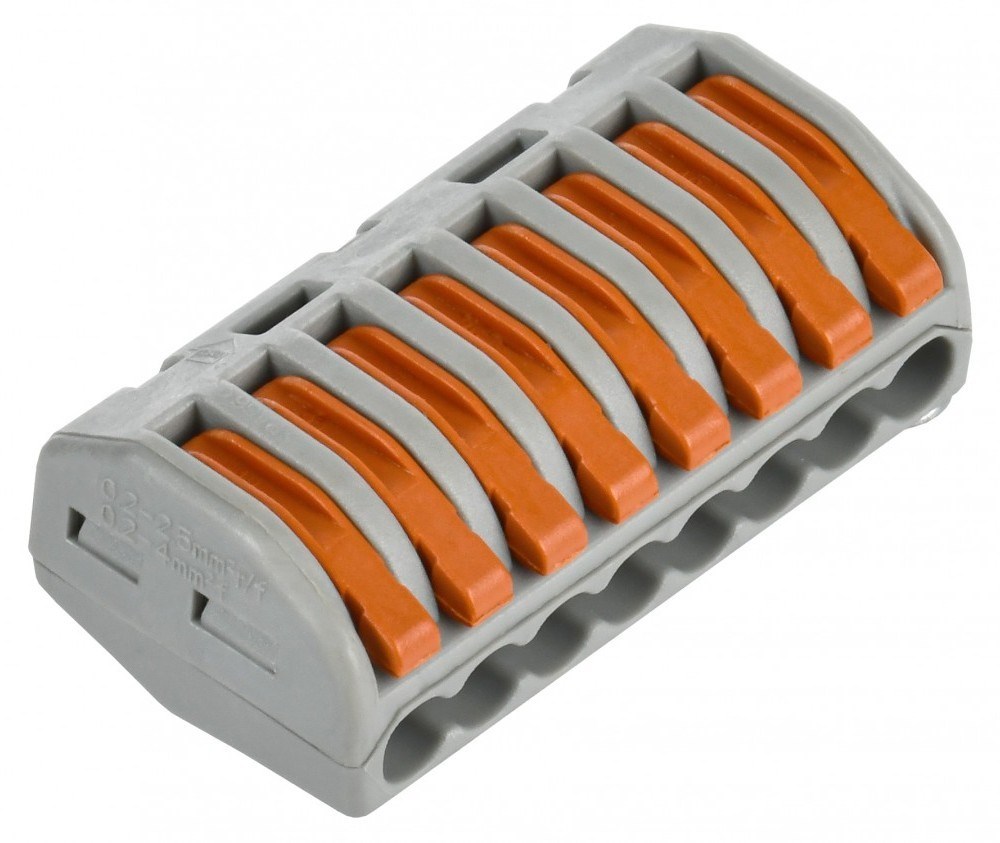 Клемма строительно-монтажная серии 222 предназначена для соединения одножильных и многожильных медных проводников без использования инструмента в электрических сетях переменного и постоянного тока. Клемма допускает многократное присоединение и отсоединение проводников. Количество подключаемых проводников - 8.