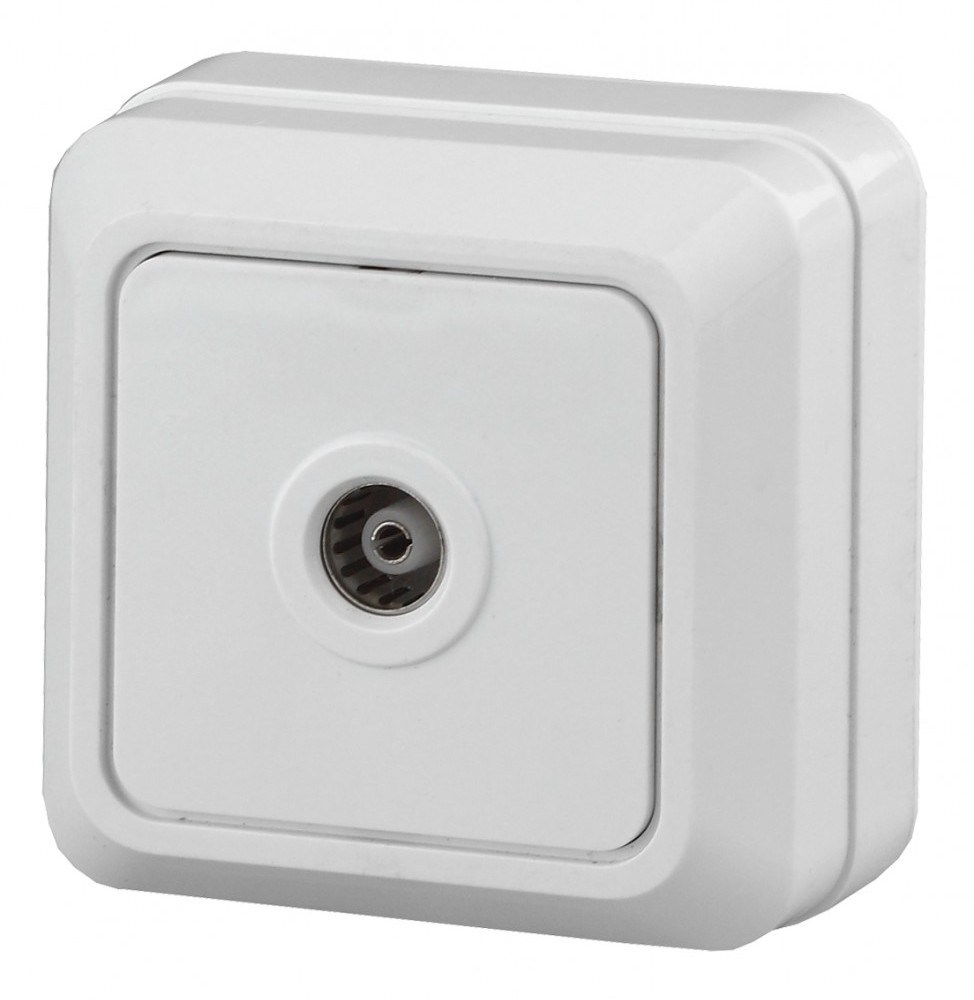 Розетка TV одиночная Intro серии Quadro открытой установки цвет белый 2-301-01; номинальные характеристики: 16А 250В, IP20. Розетка выполнена из негорючего термопласта, стали и латуни, оснащена винтовыми зажимами.