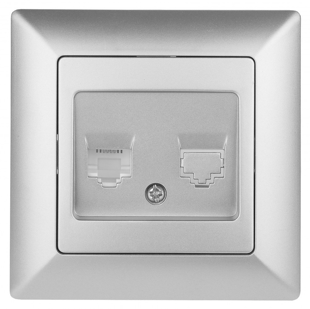 Розетка телефонная RJ11, серии Solo, скрытой установки 4-302-03 цвет алюминий. Выполнена из негорючего термопластика, укомплектована одноместной рамкой.