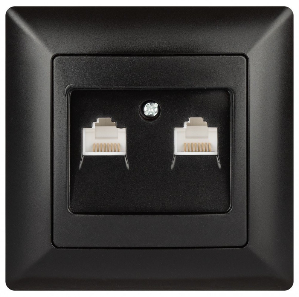 Розетка информационная на два порта 2xRJ45, серии Solo, скрытой установки 4-304-05 цвет антрацит. Выполнена из термопластика, укомплектована одноместной рамкой.