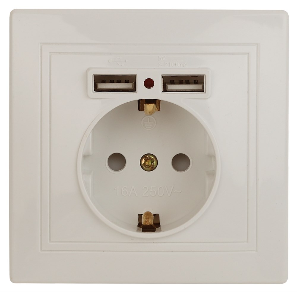 Розетка с заземлением 2P+E Schuko со шторками, 16А-250В + 2хUSB 5В-2,1А, IP20, СУ, слоновая кость Intro Plano 1-410-02