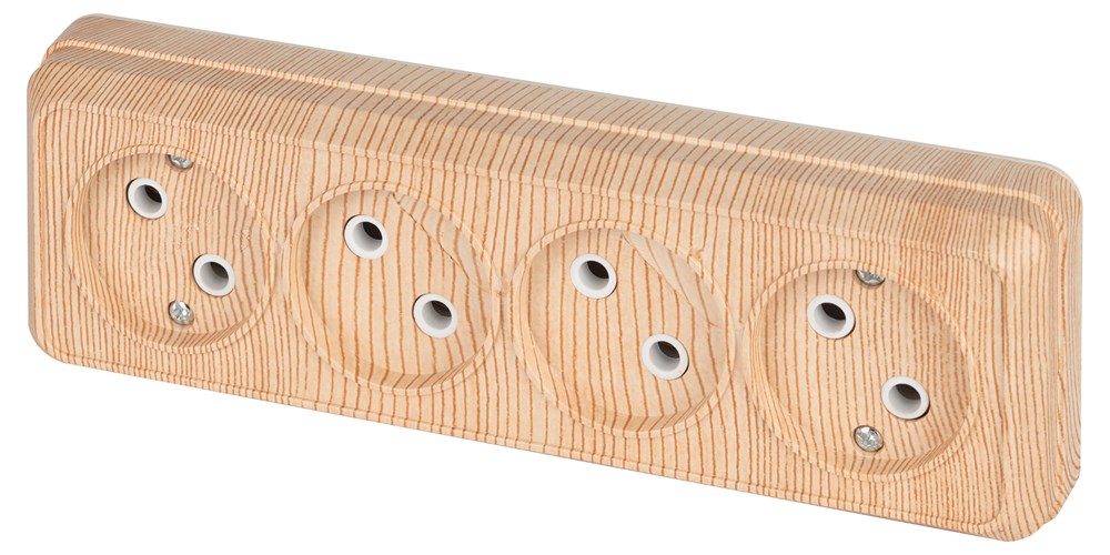 Розетка четырехместная серии Intro Quadro открытой установки цвет сосна 2-207-11. Номинальные характеристики 16А 250В. Розетка выполнена из пластика (термопласт), оснащёна винтовыми зажимами.