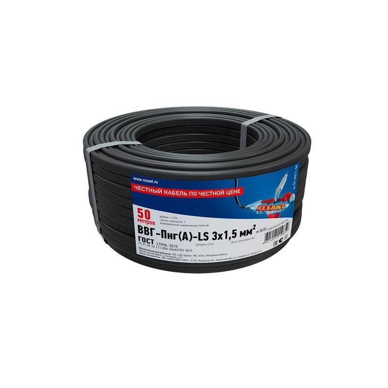 Кабель силовой медный ВВГ-Пнг(А)-LS 3x1,5 мм², длина 50 метров, ГОСТ 31996-2012, ТУ 16.К71-310-2001 Rexant 01-8271-50