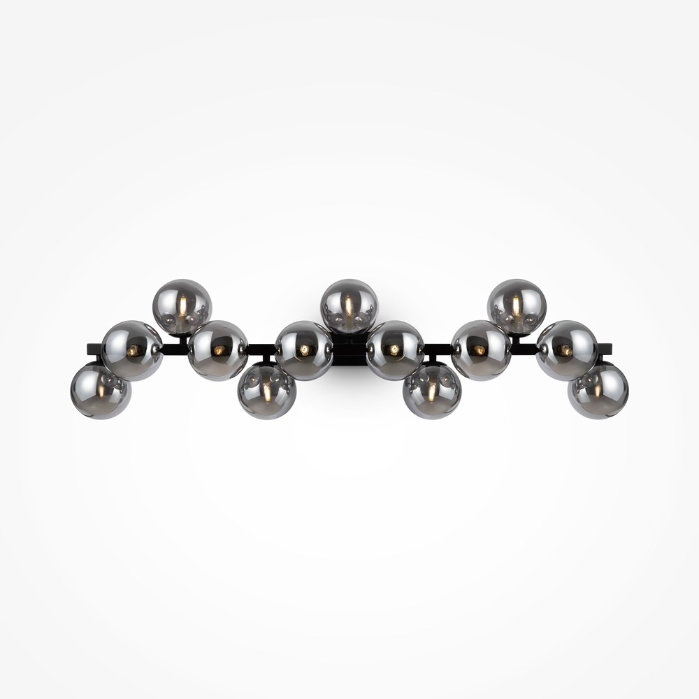 Масштабные скульптурные композиции, образованные многочисленными шарами из выдувного стекла, формируют неповторимый облик светильников серии. На полированных металлических ветвях установлены тонированные плафоны, которые мягко рассеивают и приглушают свет ламп. Модели серии представлены в трех цветах: золото, хром и латунь. Высота подвесных светильников регулируется длиной троса. Серия представлена потолочными, подвесными светильниками, и бра.