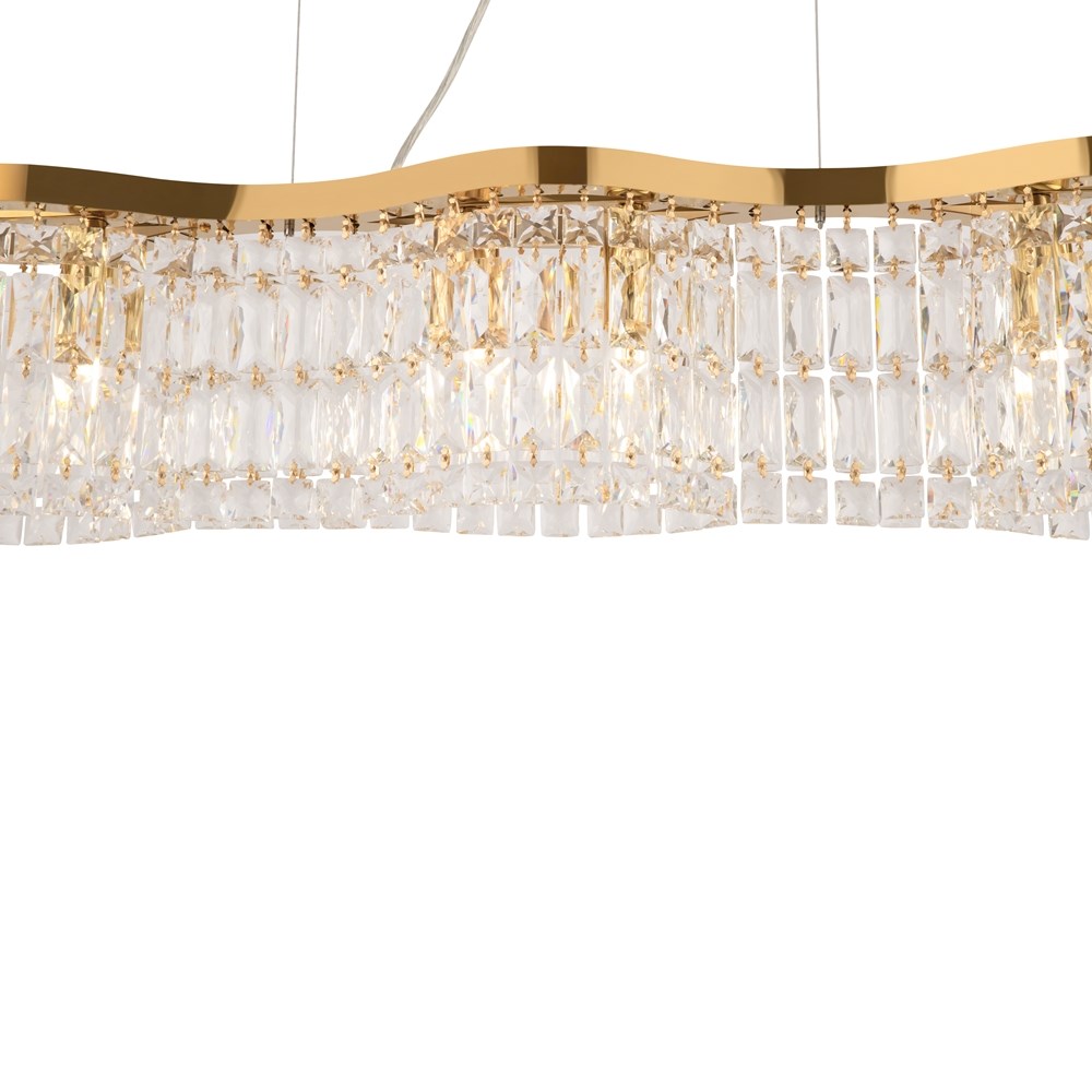 Кристаллы различных форм плотным занавесом свисают с фигурного основания, наполняя интерьер атмосферой роскоши. Арматура светильников изготовлена из хромированного металла, который отражает свет ламп. Модель DIA005PL-06CH дополнена стальными тросами, которые можно отрегулировать по длине.