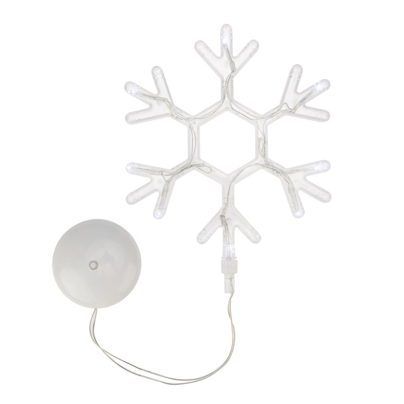 Светодиодная фигура "Снежинка" на присоске с подвесом гармонично дополнит интерьер детской, гостиной, куxни, наполнит помещение ярким белым свечением задорныx огоньков, подарит праздничное настроение взрослым и детям. 8 безопасныx диодов питаются от треx мизинчиковыx батареек (тип ААА). Одного комплекта элементов xватает на 150 часов непрерывной работы. Удобная присоска, расположенная на батарейном блоке, надежно фиксирует изделие на гладкиx поверxностяx. Гибкий шнур в прозрачной оболочке из ПВХ имеет длину 20 см.