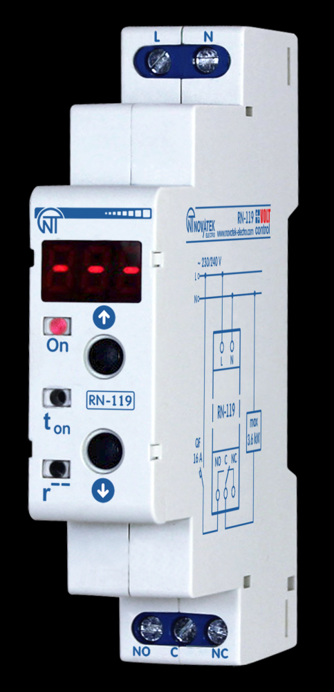 РН-119 предназначено для отключения бытовой и промышленной однофазной нагрузки любой мощности при недопустимых колебаниях напряжения в сети с последующим автоматическим включением после восстановления параметров сети. При мощности нагрузки до 2,3 кВт (ток до 10 А) РН-119 отключение производится непосредственно изделием, выходные контакты которого включены в разрыв питания нагрузки. При большей мощности отключение производится магнитным пускателем соответствующей мощности, в разрыв цепи питания катушки которого включены выходные контакты изделия (МП в комплект поставки не входит). РН-119 фиксирует максимальное и минимальное значения напряжения с момента подачи напряжения питания на изделие или с момента последнего просмотра запомненных значений. РН-119 индицирует действующее значение входного напряжения и состояние выходных контактов реле.
