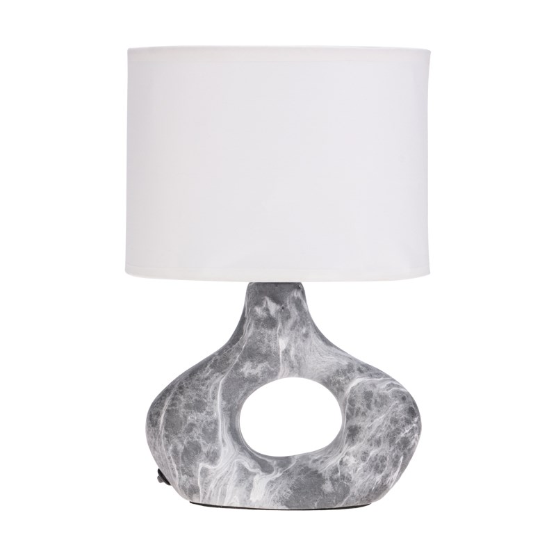 Декоративный настольный светильник с основанием в форме кольца под черный мрамор и белым абажуром станет современным и стильным интерьерным украшением.