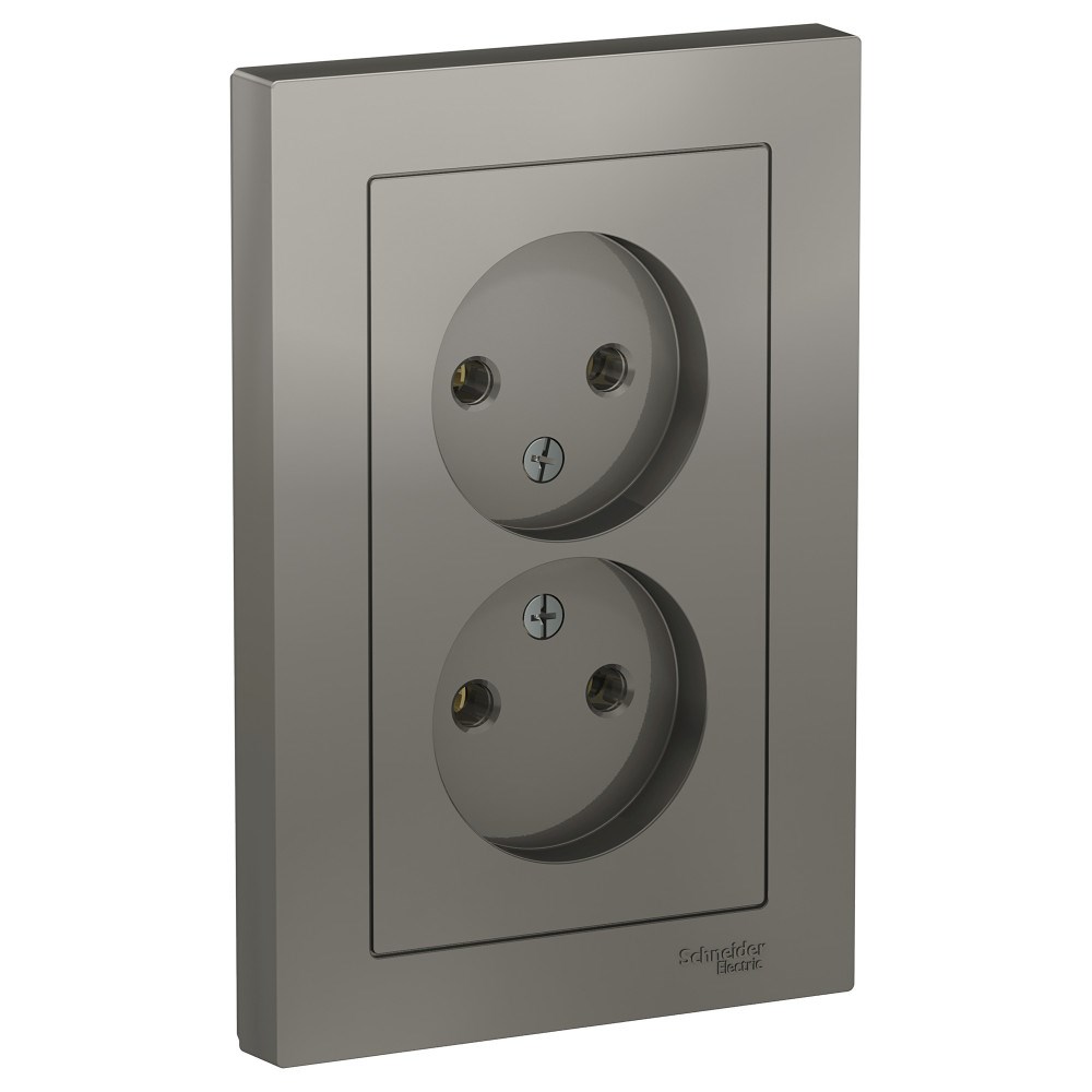 Розетка двойная Systeme Electric (ранее Schneider Electric) серии AtlasDesign (в сборе, цвет сталь) без заземления и без шторок подходит для сетей 250 В, на ток 16 А. - Лицевые детали из качественного ABS-пластика, устойчивого к царапинам и УФ-излучению. - Двойная розетка позволяет подключить два устройства в одном месте. - Усиленные прямые монтажные лапки для лучшей фиксации механизма в монтажной коробке.