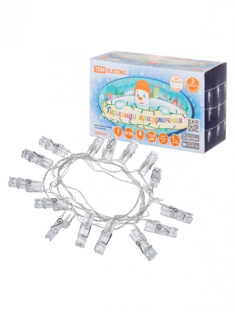 TDM Гирлянда светодиодная "Прищепки" 3 м, 15LED, белый, 8 режимов, 250 В, IP20, SQ0361-0093