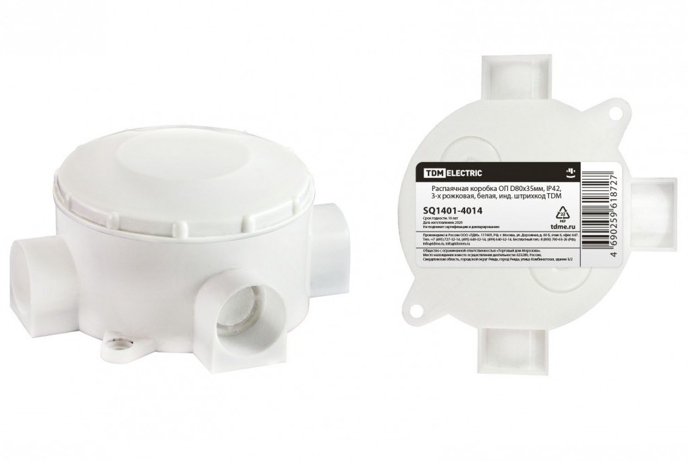 TDM Распаячная коробка ОП D80х35мм, IP42, 3-х рожковая, белая, инд. штрихкод SQ1401-4014