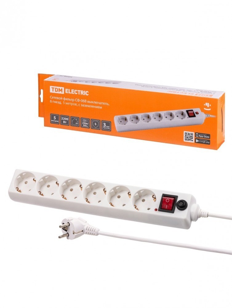 TDM Сетевой фильтр СФ-06В выключатель, 6 гнезд, 5 метров, с/з, ПВС 3х0,75мм2 10А/250В белый SQ1304-0021