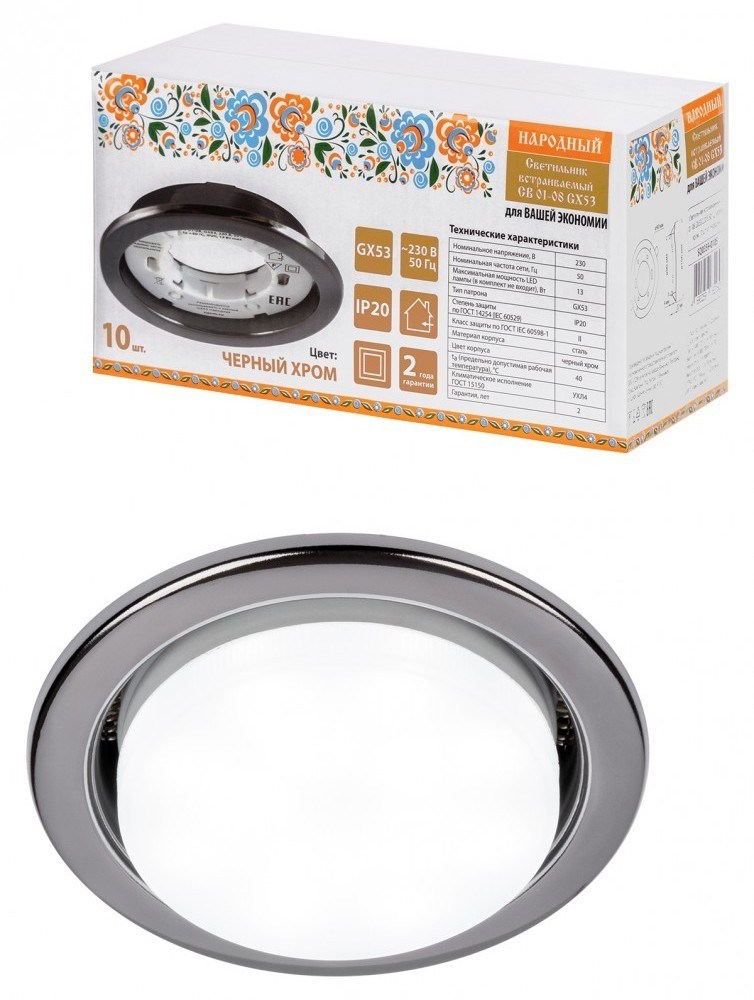TDM Светильник встраиваемый СВ 01-08 GX53 220 В 50 Гц, черный хром, 10 шт/уп, Народный SQ0359-0105