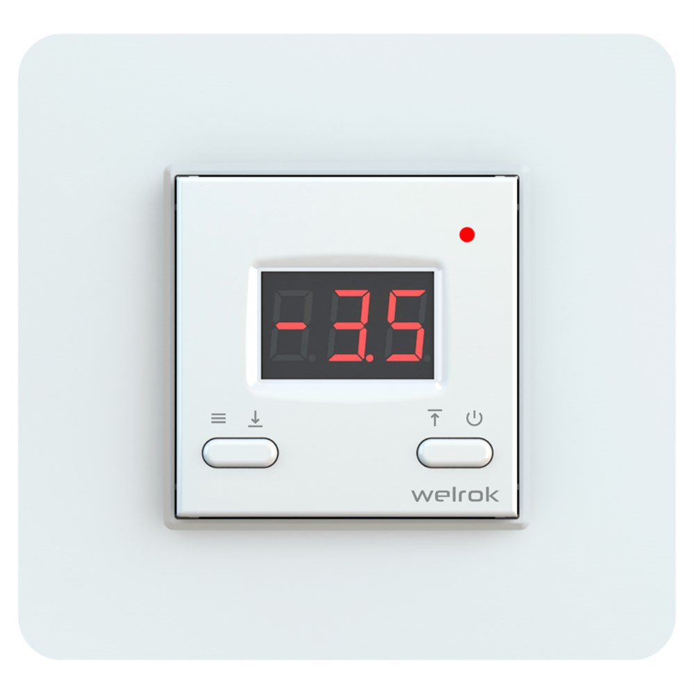 Специально для снеготаяния Welrok kt - цифровой терморегулятор для систем антиобледенения и снеготаяния, использует выводной датчик температуры воздуха. Комфорт эксплуатации Настройка температуры и навигация по меню осуществляется двумя кнопками и отображается на цифровом экране. Яркость экрана автоматически снижается до 30 % в режиме ожидания для комфортного использования в ночное время и экономии электроэнергии. Может работать с аналоговым (R10) или цифровым (DS18B20) датчиками. Устанавливается в стандартный подрозетник диаметром 60 мм. Надежность и безопасность Чтобы никто случайно не изменил параметры работы терморегулятора, вы можете заблокировать кнопки. Кроме того, устройство имеет защиту от перегрева: если температура внутри корпуса достигнет 85 °C, терморегулятор отключит обогрев и сообщит вам об этом. Когда температура снизится до 80 °C, терморегулятор возобновит работу. Комплект 1. терморегулятор Welrok kt 2. декоративная рамка 3. датчик температуры с проводом 3 метра 4. технический паспорт, инструкция по установке и эксплуатации, гарантийный талон 5. упаковочная коробка