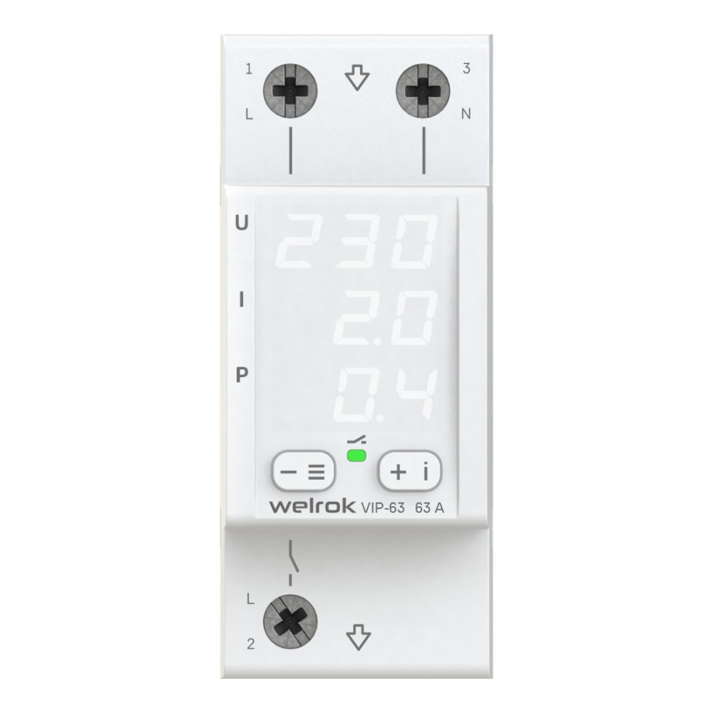 Welrok VIP-63 реле напряжения с контролем тока 63 А (max 80 A), 13 900 ВА 4660251140335