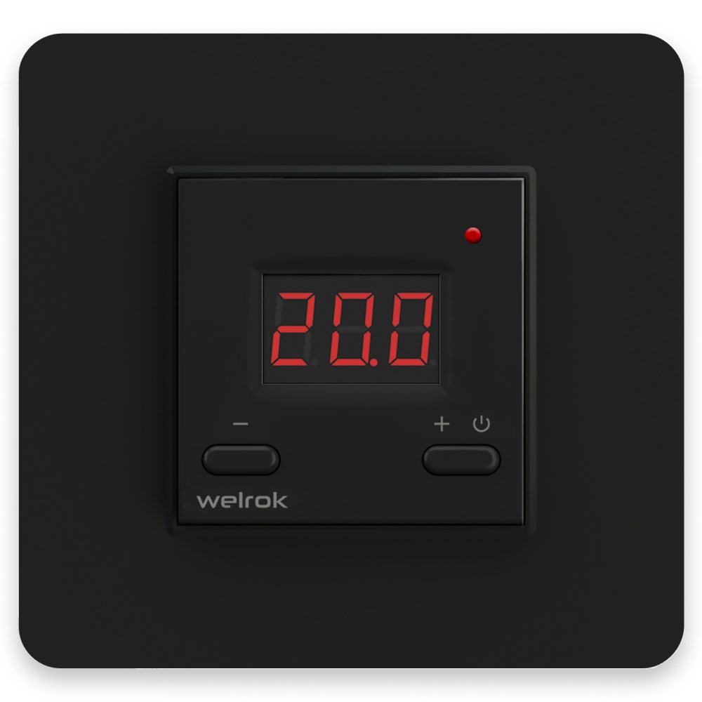 Широкое применение Welrok vt bk - цифровой терморегулятор для систем электрического отопления, таких как инфракрасные панельные обогреватели и конвекторы до 2 кВт. Термостат Welrok vt bk имеет встроенный термодатчик. Комфорт эксплуатации Настройка температуры и навигация по меню осуществляется двумя кнопками и отображается на цифровом экране. Яркость экрана автоматически снижается до 30 % в режиме ожидания для комфортного использования в ночное время и экономии электроэнергии. Для оптимальной работы системы отопления необходимо установить мощность подключенной к терморегулятору нагрузки. Устанавливается в стандартный подрозетник диаметром 60 мм. Надежность и безопасность Чтобы никто случайно не изменил параметры работы терморегулятора, вы можете заблокировать кнопки. Кроме того, устройство имеет защиту от перегрева: если температура внутри корпуса достигнет 85 °C, терморегулятор отключит обогрев и сообщит вам об этом. Когда температура снизится до 80 °C, терморегулятор возобновит работу. Комплект 1. терморегулятор Welrok vt bk 2. декоративная рамка 3. технический паспорт, инструкция по установке и эксплуатации, гарантийный талон 4. упаковочная коробка